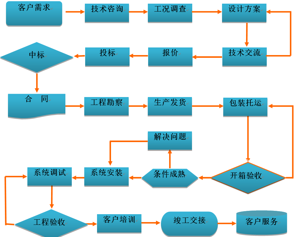 我公司經(jīng)過多年的經(jīng)驗總結(jié),形成了一套完整合理的客戶服務(wù)流程體系,服務(wù)流程包括銷售服務(wù)、系統(tǒng)設(shè)計、采購、生產(chǎn)、檢驗、工程實施、投運、維護等各個環(huán)節(jié)。公司對相關(guān)的服務(wù)流程持續(xù)的完善和優(yōu)化,使系統(tǒng)服務(wù)的質(zhì)量管理更加標準化、程序化、規(guī)范化,為系統(tǒng)服務(wù)工作奠定了扎實的基礎(chǔ)。