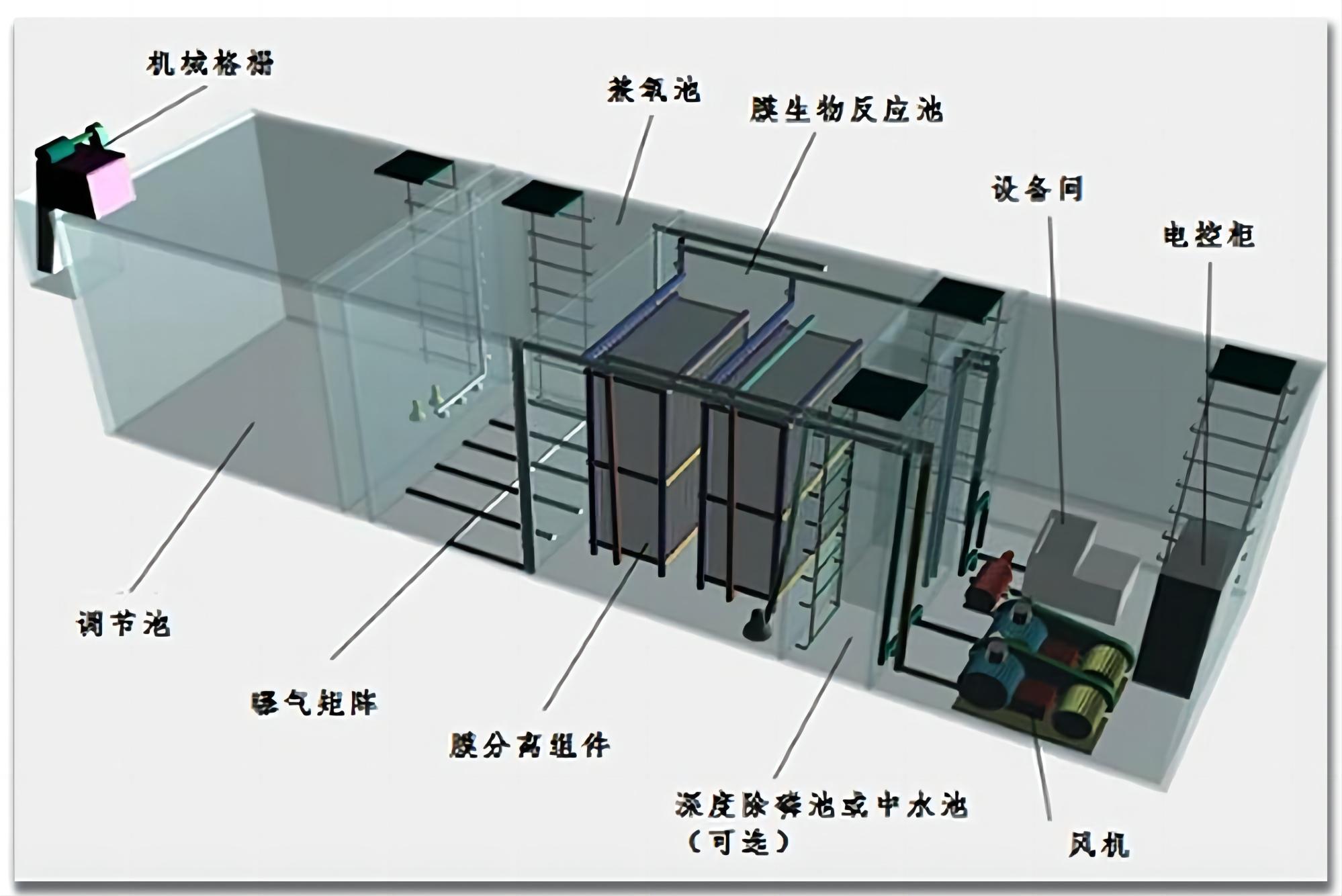 工藝原理:膜生物反應(yīng)器(MBR)工藝主要由兼氧池、MBR膜生物反應(yīng)池、深度除磷池等部分組成。通過好氧、厭氧菌的分解作用、中空纖維膜的截留作用、強化除磷填料的吸附作用等實現(xiàn)中水回用或達標(biāo)排放。